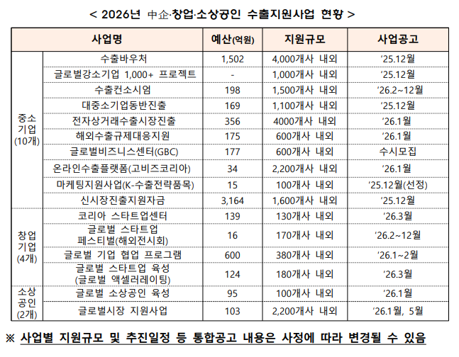 - 수출바우처: 1,502억 규모 / 약 4,000개사 지원 / 2025.12 1차 접수